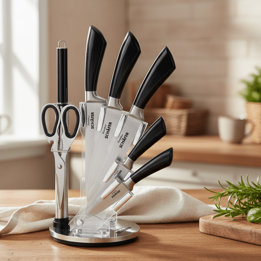 Opgrader dit køkken med dette stilfulde og funktionelle knivsæt fra Schäfer. Sættet består af 8 essentielle knive og tilbehør, der dækker alle dine behov i køkkenet. Med et moderne design og ergonomiske håndtag er dette sæt både praktisk og æstetisk tiltalende.
