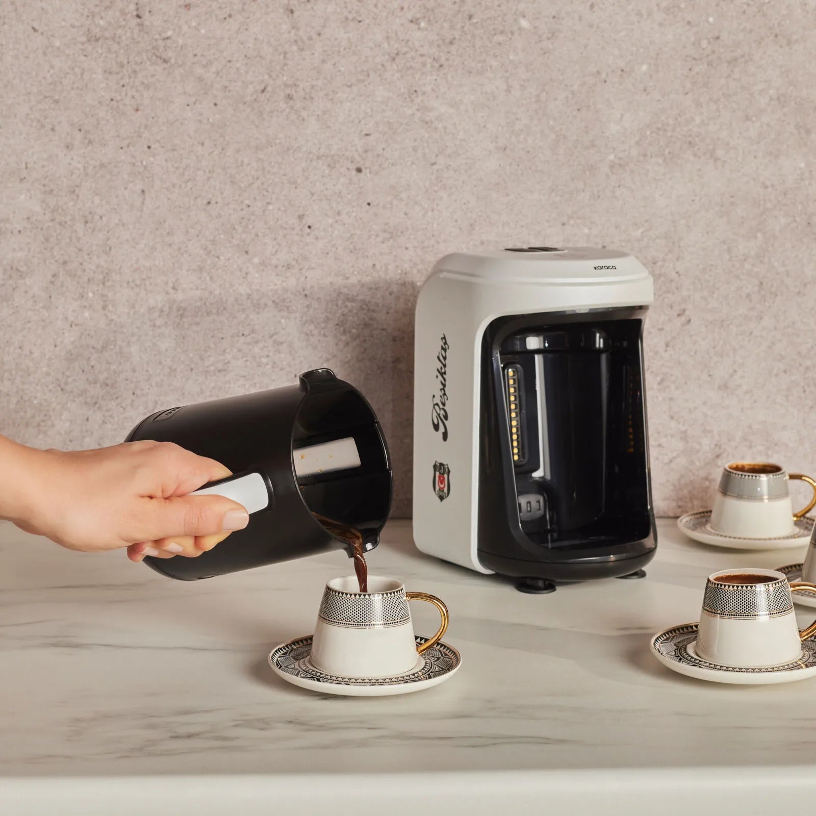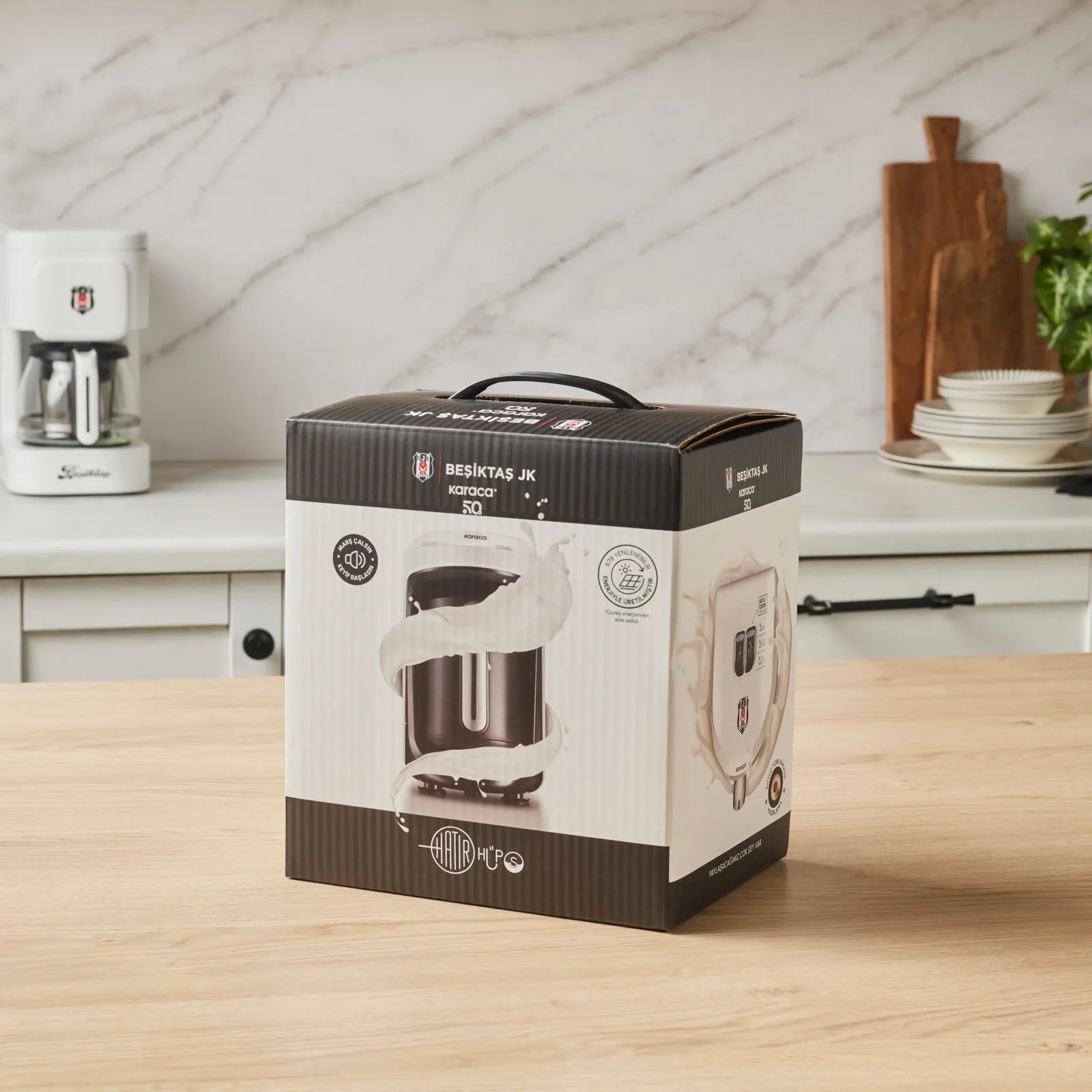 En stilfuld og funktionel kaffemaskine, der kombinerer tradition, teknologi og Beşiktaş-design – perfekt til kaffeelskere, der ønsker en autentisk kaffeoplevelse derhjemme.