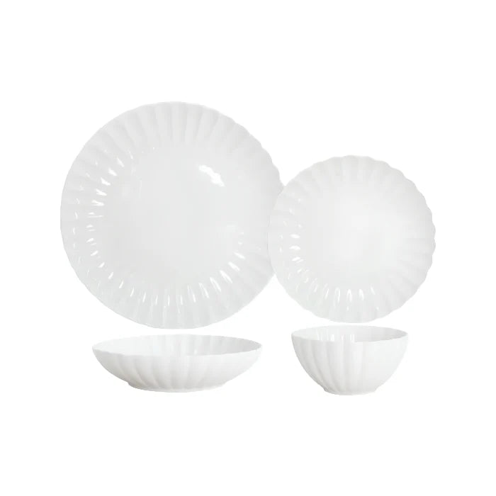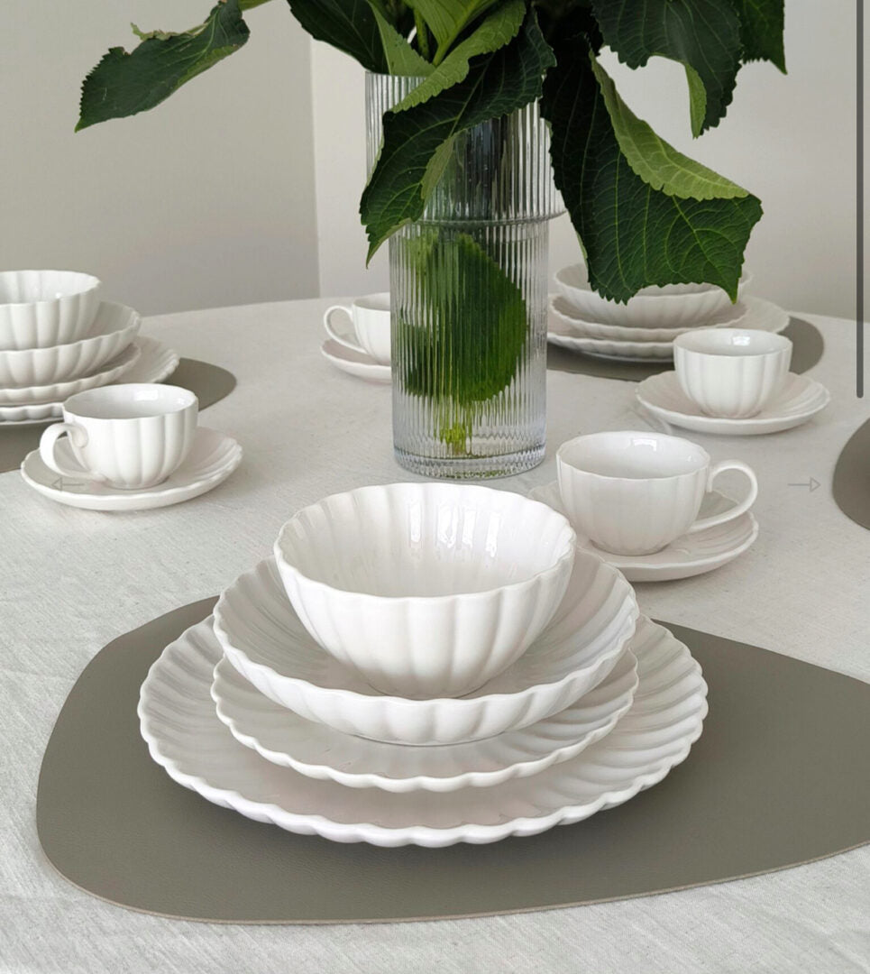 Dæk et bord, der emmer af forår og elegance med det unikke Almina Daisy middagsstel. Som navnet antyder, er dette stel inspireret af marguerittens fine form, hvor hver tallerken og skål er formet som de smukkeste kronblade. Med sin rene hvide farve er Daisy-sættet det perfekte valg til både bryllupper, festlige lejligheder og når hverdagen skal have et løft.