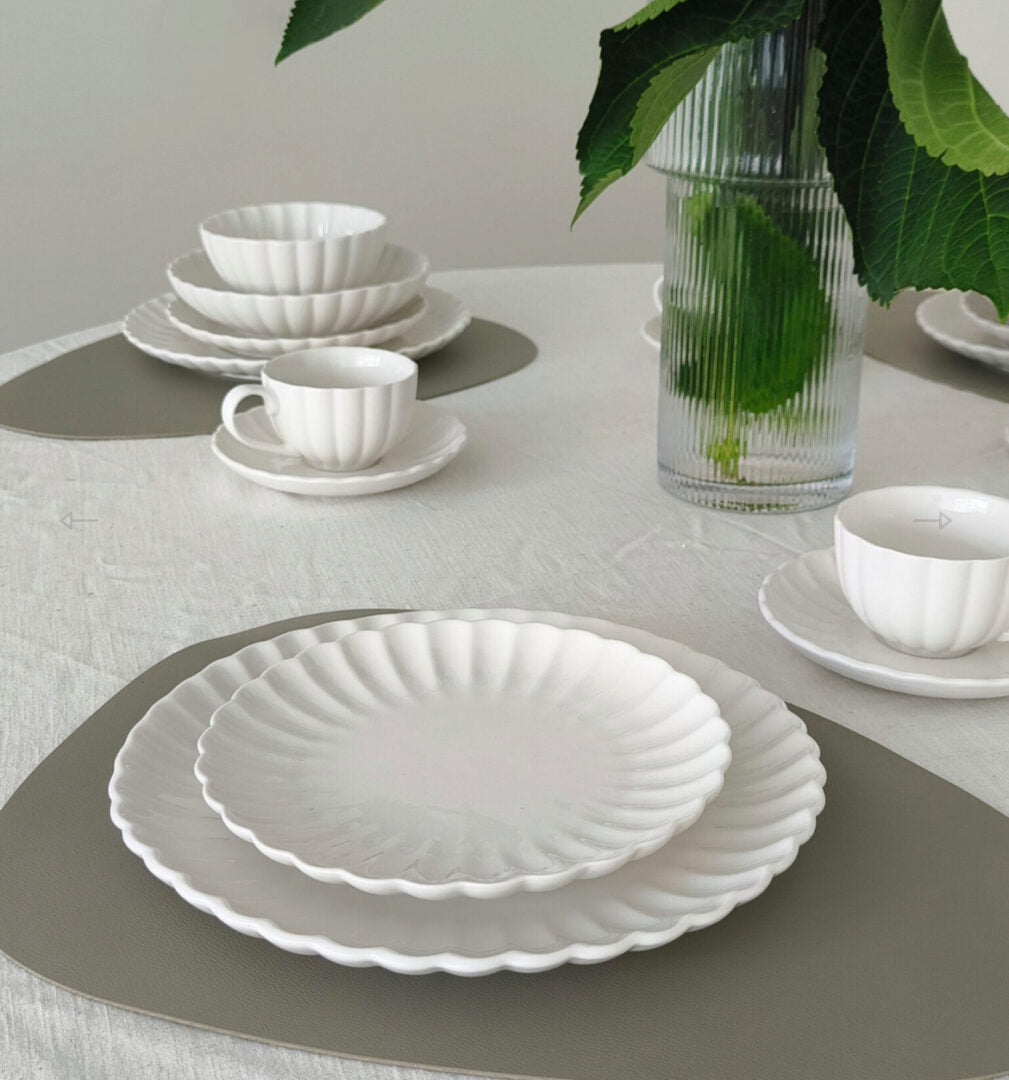 • Daisy-form: Den bølgede kant efterligner kronbladene på en blomst, hvilket giver borddækningen et organisk og romantisk udtryk.