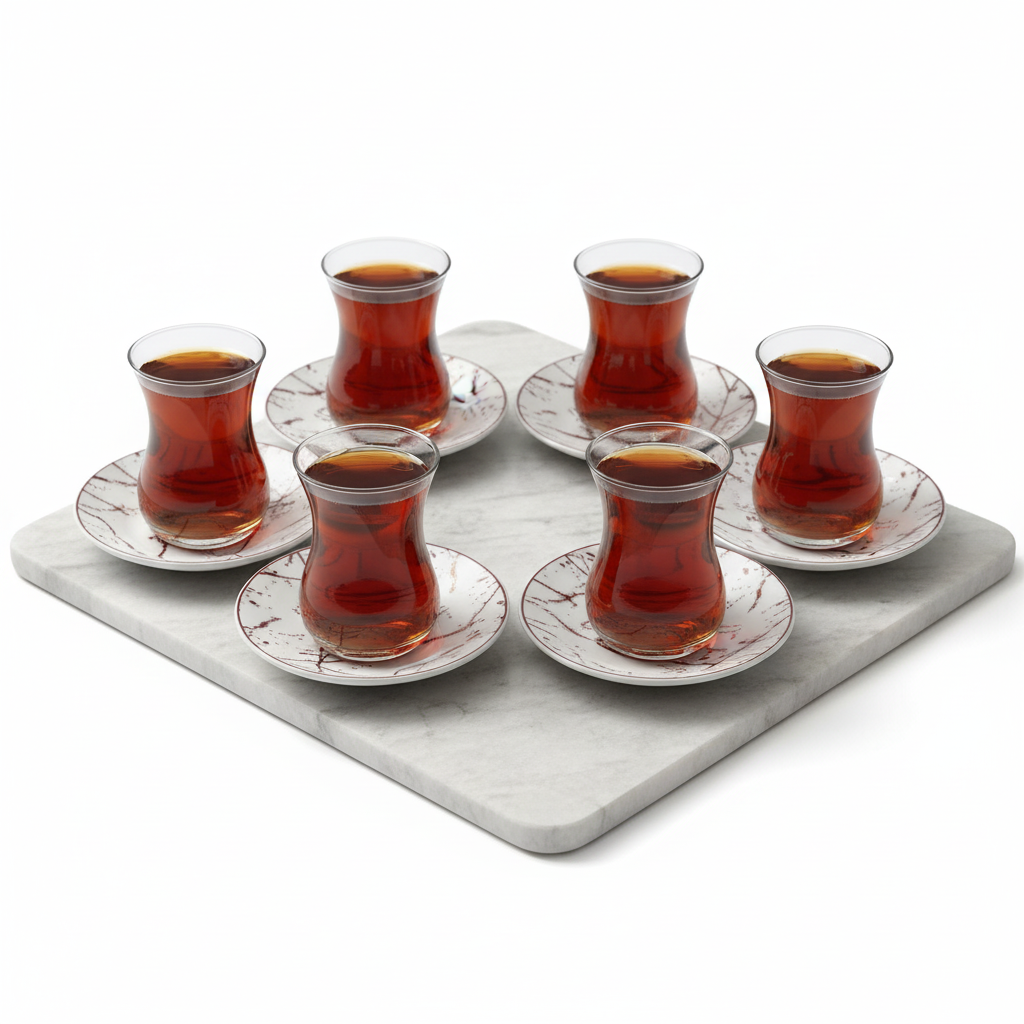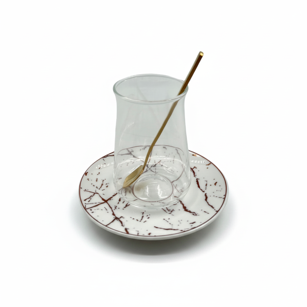 Forkæl dit te-ritual med dette eksklusive Bricard Marmor Teglassæt i rosaguld. Sættet består af 18 elegante dele og kombinerer glas, porcelæn og luksuriøse detaljer, der løfter enhver servering. De klare teglas, de smukke marmormønstrede undertallerkener og de gyldne teskeer skaber et harmonisk og stilfuldt udtryk, der passer perfekt til både hverdag og festlige anledninger.
