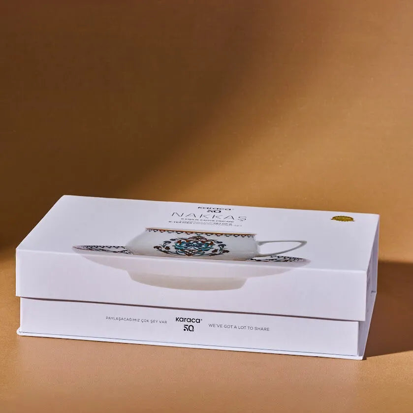 Oplev klassisk elegance med Karaca Nakkaş. Dette smukke kaffesæt til 6 personer kombinerer traditionelt mønsterdesign med et luksuriøst udtryk.