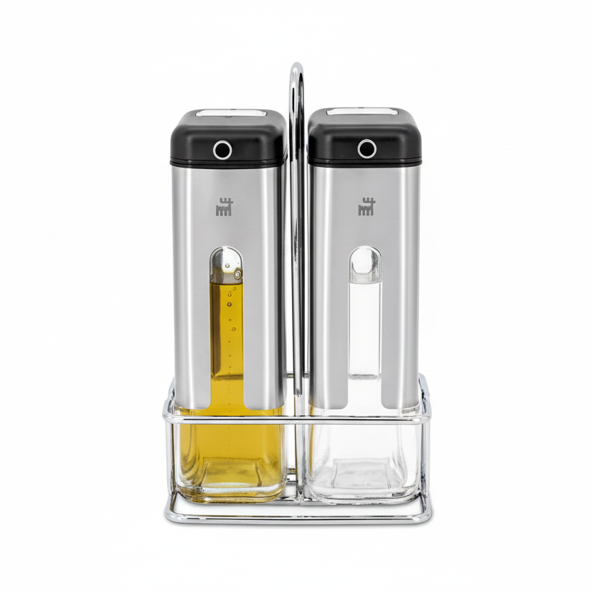 Sættet består af én oliedispenser og én eddikedispenser, som er samlet i en praktisk og stilfuld metalholder, der sikrer nem håndtering og pæn opbevaring. De klare glasbeholdere gør det let at se indholdet og dosere præcist.