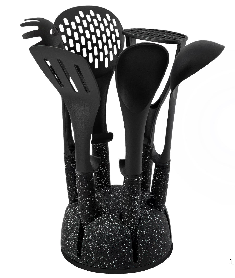 Dette praktiske og stilfulde sæt omfatter syv køkkenredskaber, der hjælper dig i daglig madlavning og servering. Den sorte base med subtile marmoragtige detaljer giver et moderne og eksklusivt udtryk, som matcher mange stilarter og farveskemaer i køkkenet.