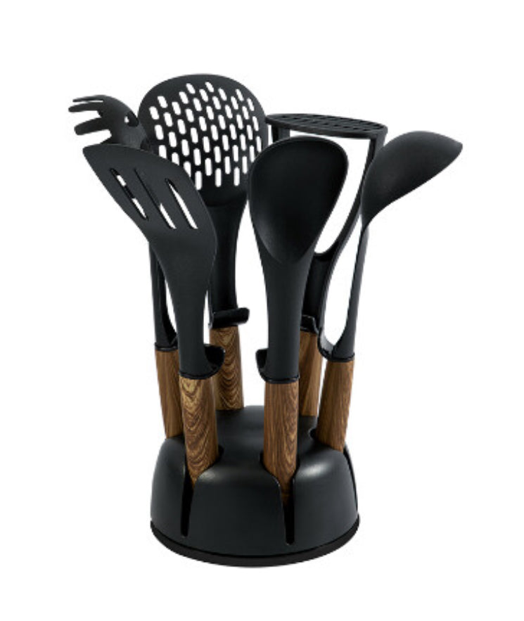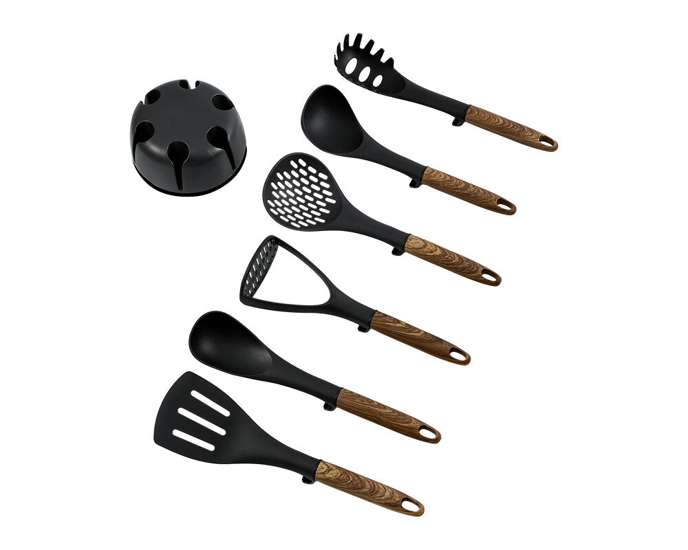 Dette komplette hjælper-sæt fra Schäfer leveres med syv essentielle redskaber i højkvalitets nylon, med varmebestandige ender og ergonomiske håndtag med træ-look (maple wood-effekt). Infrafoden er designet, så redskaberne kan hænges på kanten af gryder uden at røre bordfladen — en praktisk detalje, der mindsker rod og holder dit arbejdsområde rent.