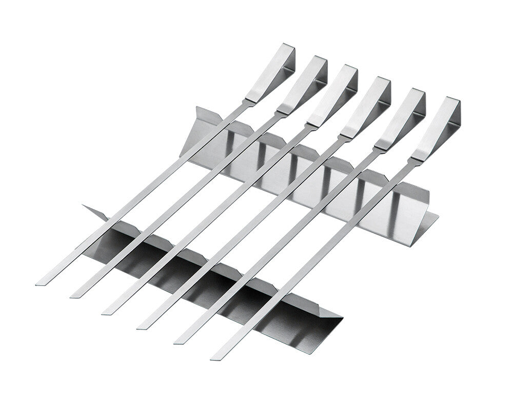 De lange spyd på 39 cm gør det let at tilberede kød, grøntsager og fisk jævnt, mens den effektive spydlængde på 28 cm giver god plads til råvarerne. De medfølgende stativer sørger for stabil placering under tilberedning og servering, så maden ligger sikkert og præsenteres pænt.