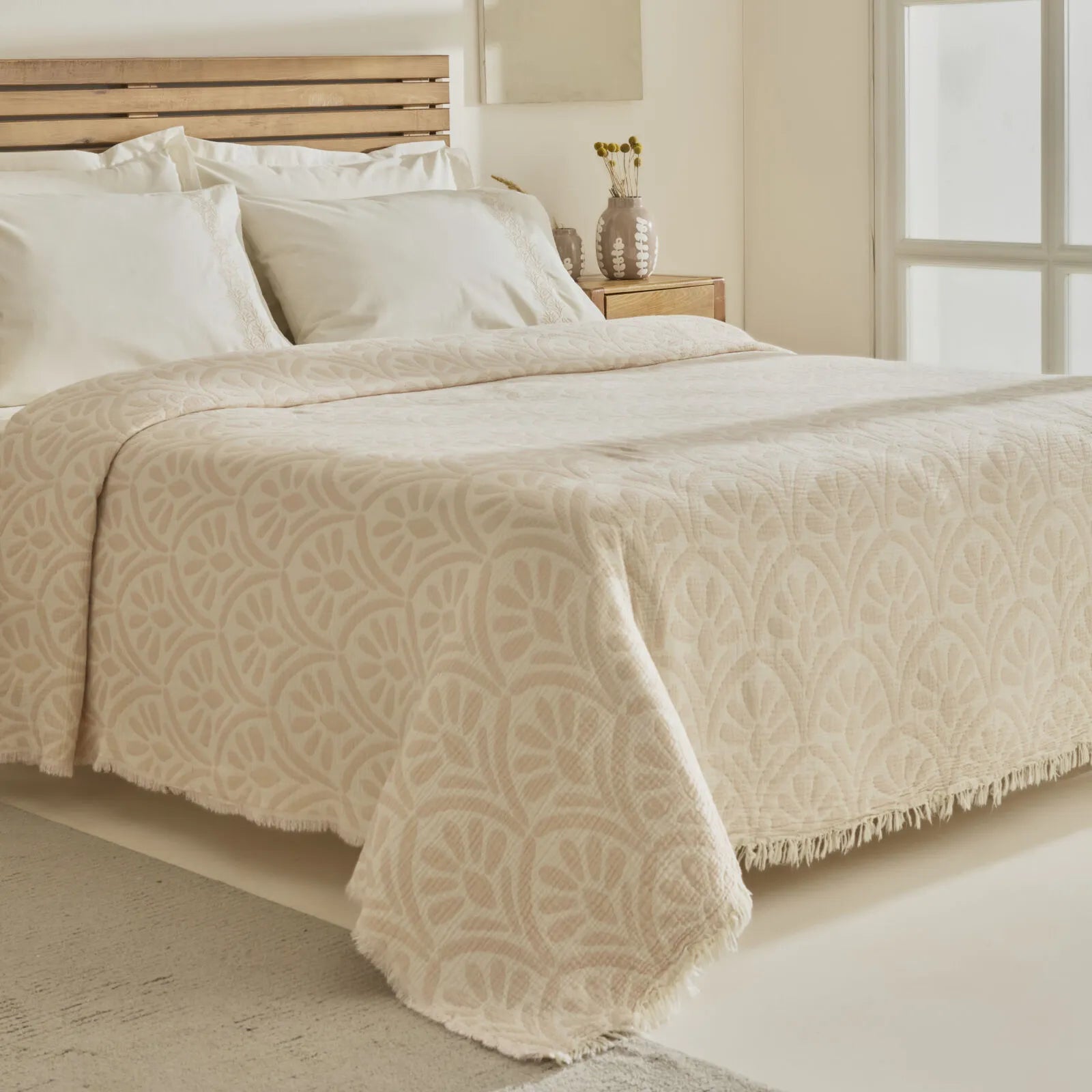 Det lette sengetæppe er ideelt til de varmere måneder, hvor du ønsker en behagelig og åndbar løsning, mens de matchende pudebetræk og det bløde bomuldslagen fuldender et sammenhængende og stilfuldt look.